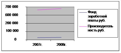 Р и с у н о к 6 – Темпы прироста производительности труда и заработной платы за 2007-2008 г. По данным графика видно, что темпы прироста производительности труда (6,6%) были выше темпов прироста фонда заработной платы (2,3%), что свидетельствует о повышении эффективности организации труда в 2008 году по сравнению с 2007 годом. Абсолютный темп прироста определим по формуле: