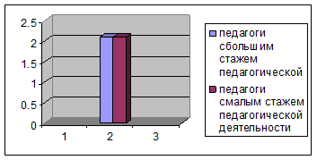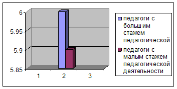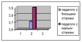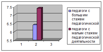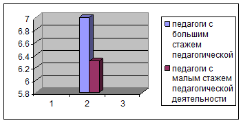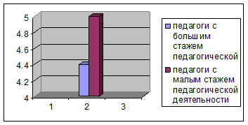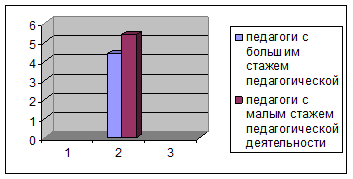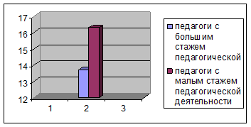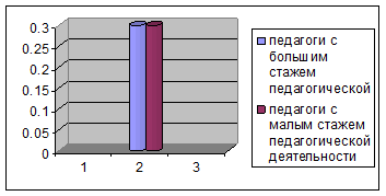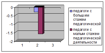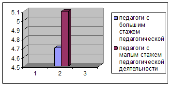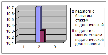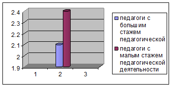 Уровень директивности у педагогов с большим и малым стажем педагогической деятельности (методика «Handtest»). Как видно из Табл. 14., средний балл уровня директивности у педагогов с большим стажем педагогической деятельности – 2,1, средний балл уровня директивности у педагогов с малым стажем педагогической деятельности – 2,4.