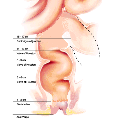Прямая кишка является конечным отделом толстой кишки. Начало прямой кишки соответствует уровню верхнего края 3 крестцового позвонка. Как раз на этом примерно уровне и происходят те изменения в строении толстой кишки, которые отличают прямую кишку от вышележащих отделов: кишка постепенно теряет свою брыжейку; продольная мускулатура толстой кишки здесь распределяется равномерно по всей окружности, не образую трех лент, как на остальном протяжении кишки; Изменяется направление кровеносных сосудов - верхняя прямокишечная артерия дает ветви, идущие по кишке продольно; кишка с указанного уровня начинает расширяться. Различают два основных отдела прямой кишки: тазовый и промежностный: первый лежит выше диафрагмы таза, второй - ниже. В тазовом отделе выделяют ампулу (самую широкую часть прямой кишки) и небольшой участок над ней - надампулярную часть. Последнюю вместе с конечным отделом сигмовидной кишки часто называют тазовой кишкой (colon pelvinum), или ректосигмоидным отделом толстой кишки. Промежностный отдел прямой кишки называют также заднепроходным каналом (canalis analis). Прямая кишка образует искривления во фронтальной и сагиттальной плоскостях. Особенно важными в практическом отношении два изгиба в сагиттальной плоскости (они соответствуют искривлениями крестца и копчика) и изгиб влево во фронтальной плоскости. Отношение прямой кишки к брюшине таково. Надампуллярная часть кишки покрыта брюшиной со всех сторон. Далее кишка начинает терять брюшинный покров сначала сзади, будучи покрыта брюшиной только спереди и с боков, а еще ниже, на уровне 4 крестцового позвонка (и частично 5), брюшина покрывает только переднюю поверхность кишки и переходит у мужчин на заднюю поверхность мочевого пузыря. Нижняя часть ампулы прямой кишки лежит под брюшиной. С боков от прямой кишки брюшина образует plicae retrovesicales. Между ними и боковыми стенками таза образуются углубления fossae pararectales. В подбрюшинной клетчатке этих ямок проходят мочеточники и ветви внутренних подвздошных сосудов, а в самих ямках лежат петли кишок. Кпереди от прямой кишки у мужчин находится задняя поверхность предстательной железы, а выше железы - часть задней стенки мочевого пузыря, ампулы семявыносящих протоков, непокрытая брюшиной часть семенных пузырьков; кпереди последних - мочеточники. Через переднюю стенку прямой кишки можно пальпировать предстательную железу и семенные пузырьки, исследовать прямокишечно-пузырное пространство и вскрывать тазовые абсцессы. Через боковые стенки прямой кишки можно пальпировать часть костно-тазового кольца. Сзади прямая кишка примыкает к крестцу и копчику. С боков от промежностного отдела прямой кишки находятся седалищно-прямокишечные ямки (fossae ichiorectales). Слизистая оболочка кишки образует складки: ближе к заднепроходному отверстию - продольные, а выше - поперечные. Продольные складки часто называют морганиевыми столбиками; между ними находятся анальные (морганиевые) пазухи, ограниченные снизу полулунными анальными заслонками. Поперечные складки слизистой, не исчезающие при наполнении прямой кишки, располагаются в разных отделах ее. Одна из них соответствует положению n.sphincter tertius и находится на границе между ампуллярной и надампуллярной частью кишки. В ампуллярной части имеется одна складка на правой стенке, две - не левой. На границе ам