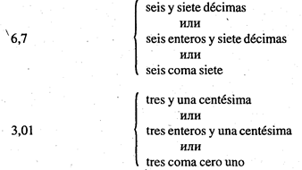 Примечания. 1. При написании десятичных дробей в испанском языке дробь от целого может отделяться точкой: 37.2; 5.73. 2. В испанском языке проценты изображаются тем же знаком, что и в русском: 12.3%; 51,96% или 51.96%. Читаются они по схеме: