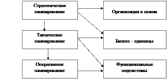 Рис. 1. 1 Взаимосвязь между планами организации Характер взаимосвязи между планами организации показывает, что основу всей системы должны составлять стратегические планы. На сегодняшний день стратегическое планирование предмет активной разработки современного управления. Цель стратегического планирования: адаптация предприятия к прогнозируемым изменениям внешней среды, достижение надежной позиции на рынке, обеспечивающей финансовую устойчивость предприятия в условиях конкуренции. К задачам стратегического планирования относятся: правильно и своевременно оценить возможные последствия перемен, происходящих в социальной, экономической и научно-технической сферах, предвидеть опасности и возможности, выработать хозяйственную политику и стратегию фирмы, позволяющие справиться с опасностями и использовать возникающие новые возможности. Процесс стратегического планирования является инструментом, с помощью которого обосновываются управленческие решения в области хозяйственной деятельности. Его важнейшая задача обеспечить нововведения и организационные изменения, необходимые для жизнедеятельности предприятия. Как процесс стратегическое планирование включает четыре вида деятельности (функции стратегического планирования). К ним относятся: распределение ресурсов, адаптация к внешней среде, внутренняя координация и регулирование, организационные изменения. [2, с. 221]. Основные объекты стратегического планирования: продукция, рынки сбыта, новые технологии, взаимоотношения с обществом, внешнеэкономическая деятельность. Горизонт стратегического планирования определяется продолжительностью инновационных и структурных изменений в организации. Данный вид планирования является функцией высшего уровня управления организацией. Стратегическое планирование представляет собой набор процедур и решений, с помощью которых разрабатывается стратегия предприятия, обеспечивающая достижение целей функционирования предприятия. Логика этого определения такова: деятельность аппарата управления и принимаемые на ее основе решения формируют стратегию функционирования предприятия, которая позволяет фирме достичь своих целей. Цель тактического планирования – последовательная поэтапная реализация выработанной стратегии. Задача тактического планирования: конкретизация стратегических целей, применительно к более короткому отрезку времени; выбор наиболее эффективных путей реализации стратегии; пропорциональное развитие и наилучшее использование потенциала предприятия, обеспечение текущей финансовой устойчивости и рентабельности. Объекты тактического планирования – это, прежде всего номенклатура продукции и динамика производительных мощностей. Тактическое планирование – это функция плановых служб организации при участии других функциональных подразделений. Оперативное планирование является продолжением тактического планирования. Его цель состоит в обеспечении повседневной согласованной работы всех подразделений организации по достижению перспективных и текущих целей при наилучшем использовании ресурсов. Содержание оперативного планирования – формирование плановых заданий в подразделениях организации на короткие промежутки времени на основе заданий, разработанных в ходе тактического план