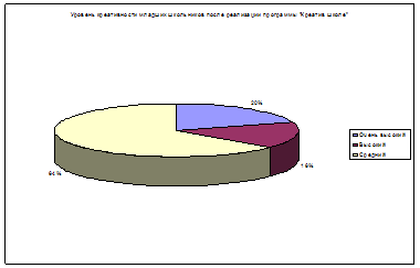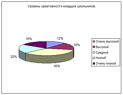 По результатам наблюдения можно отметить, что из двадцати пяти обследуемых детей, нет детей с низким уровнем креативности; 16 детей, что составляет 64% от общего числа детей имеют нормальный (средний) уровень креативности; 4 ребенка, что составляет 16% от общего числа детей имеют высокий уровень креативности и 5 детей, что составляет 20% от общего числа детей имеют очень высокий уровень креативности Результаты диагностики младших школьников 2 – А класса МОУ СОШ № 30 по батарее тестов предложенных Е.Туник, являющимися модификацией тестов Гильфорда и Торренса зафиксированы в Приложение 1, таблице 4. Результаты вынесем в отдельную таблицу (Таб.5) Таблица 5.Соответствие количества детей, % от общего количества показателям креативности после реализации программы «Креатив в школе»