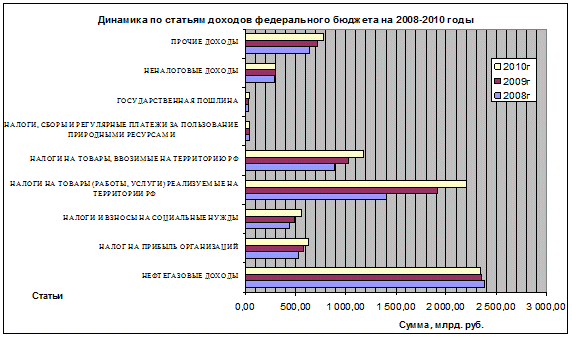 Рисунок 1 - Динамика по статьям доходов федерального бюджета на 2008-2009, и на плановый 2010 год На рисунке 1 наглядно изображено, какие изменения происходят в поступлениях в федеральный бюджет. Ненефтегазовые доходы или ещё их называют доходы без учета нефтегазовых доходов. В общем объеме этот показатель растет, к 2010 году составит 5 741,35 млрд. руб., увеличившись на 1480,01 млрд. руб. по отношению к 2008 году. Рассмотрим подробнее статьи этого раздела. Налог на прибыль организаций. Эта статья в динамике растет. В абсолютном выражении мы видим, что к 2009 году происходит увеличение поступлений на 50,38 млрд. руб., к 2010 ещё на 52,52 млрд. руб., что составит 636,28 млрд. руб., в общем, этот показатель к 2010 году увеличился в 2 раза по темпам роста. Удельный вес этого показателя снижается от 8,03% - 7,87%. В соответствии с изменениями в налоговом законодательстве, произошли изменения в поступлении средств в этот раздел доходов. Прогнозируется уменьшение налогооблагаемой базы налога на прибыль, но компенсируется увеличением по операциям с ценными бумагами, так, же повлекли изменения по ставке налога, а так, же налоговым контролем от скрывания прибыли. Заключение Бюджет Российской Федерации является важнейшим звеном финансовой системы страны. Отражая содержание процессов производства и распределения общественного продукта и национального дохода, бюджет представляет собой экономическую форму образования и использования основного централизованного фонда денежных средств государства. Совокупность всех видов бюджетов образует бюджетную систему государства. Взаимосвязь между ее отдельными звеньями, организацию и принципы построения бюджетной системы принято называть бюджетным устройством. Бюджетная система призвана играть важную роль в реализации финансовой политики государства, цели которой обусловливаются его экономической политикой. Процесс преобразования бюджетной системы - сложный, длительный, порой весьма болезненный. Тем не менее, начало ему уже положено. И от успешного его завершения зависит будущее всей российской экономики. Правильная группировка и распределение государственных доходов может положительно сказаться на регулировании государственной экономики и может реально влиять на рост экономики и социальной сферы, ускорение темпов научно-технического прогресса, обновление и совершенствование материально-технической базы общественного производства. Доходы бюджета на сегодняшний день значительны во всех отношениях. Федеральный бюджет на 2010-2011 год должен стать надежным инструментом реализации экономической и социальной политики Правительства РФ. Важнейшая задача - обеспечить его прозрачность для всех членов общества. Необходимо добиться, чтобы федеральный бюджет стал средством стабилизации государственных финансов. Он должен превратиться в надежную опору и гаранта для всех определенных законом получателей средств. Решить названные задачи можно, лишь объединив усилия Президента Российской Федерации, Правительства Российской Федерации и палат Федерального Собрания. Это крайне важно с учетом особенности подготовки проекта федерального бюджета на 2010 год - необходимости его принятия. Правительство Российской Федерации должно стать организующим центром этой работы. Сложность рассмотренных выше проблем показывает, что эффект