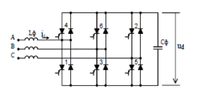 Рисунок 4 – Схема трехфазного активного выпрямителя на основе АИН. В простейшем случае для изучения свойств АВ представим, что нагрузка имеет активный характер. Работа АВ основана на работе повышающего импульсного преобразователя постоянного напряжения, что иллюстрирует рисунок 2.