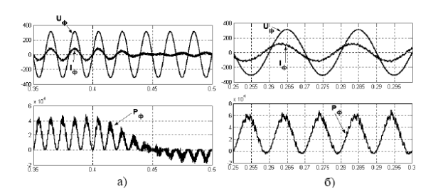 Рисунок 12 – Векторные диаграммы работы АВ: а) cosϕ=1; б) 0<cosϕ<1, ϕ<0; в) cosϕ=-1; г) 0> cosϕ>-1, -π/2>ϕ>-π. Напряжение в звене постоянного тока Ud>Ud0 (Ud0 – амплитуда выпрямленного напряжения мостовой схемы), что подтверждает рисунок 11. Кроме того, АВ может не просто обеспечить cosϕ=1 (рис.12, а), но и генерировать реактивную (рис.12,б) или активную мощность (рис.12,в), а может одновременно совмещать генерацию активной и реактивной мощности (рис.12,г). Однако в режиме генерации реактивной мощности АВ потребляет из сети полный ток I больше (добавляется реактивная составляющая тока), что видно из величины падения напряжения на индуктивности UL, если сравнить рисунки 12,а и 12,б.Осциллограммы фазных напряжения Uф, тока Iф и мощности Pф при работе АВ в двигательном и генераторном режимах, а также в режиме генерации реактивной мощности, полученные путем моделирования в программном пакете MATLAB 6, с использованием его приложений SIMULINK и POWERSYSTEM BLOCKSET - подтверждают теоретические положения статьи и представлены на рисунке 13.