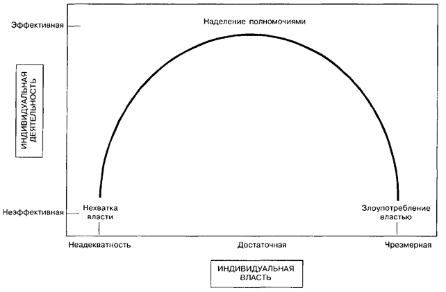 Рис. 1.3. Управленческая решетка Блейка-Моутон Анализ собственного стиля лидерства чрезвычайно полезен каждому менеджеру. Для его проведения необходимо хотя бы в общих чертах владеть навыками самоанализа и понимать основные особенности своей личности. Поэтому, прежде чем выполнить следующее упражнение, целесообразно познакомиться с материалом раздела 2.1.1. Подход Блейка и Моутон, пусть неявно, указывает на существование наилучшего стиля лидерства — группового управления* с координатами (9, 9). Между тем, практика свидетельствует, что во многих случаях эффективными оказываются и другие стили лидерства. Более того, изменения в организации могут потребовать смены стилей лидерства. Возникает вопрос: чем следует руководствоваться при выборе стиля лидерства? Ответ на этот вопрос отчасти дают теории ситуационного лидерства. Возможность «переключения скоростей» лидерства определяется во многом тем, какой властью и влиянием обладает менеджер. Нехватка властных полномочий может резко снижать эффективность индивидуальной деятельности менеджера, в то время как их избыток может приводить к злоупотреблению властью, как показывает рис. 1.4. Исследователи давно интересовались источниками личной власти. Американские исследователи Дж. Френч и Б. Рейвен предложили классификацию, основанную на выделении пяти основных источников власти. Краткое описание этих источников приведено в табл. 1.3.
