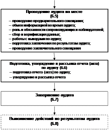 Примечание – Пунктирные линии указывают на то, что по завершению аудита могут выполняться действия по результатам аудита, которые не являются частью аудита. Рисунок 2 – Типовая схема проведения аудита 6.2.5 Установление первоначального контакта с проверяемой организацией Первоначальный контакт официального или неофициального характера с проверяемой организацией для проведения аудита устанавливает ответственный за управление программой аудита или руководитель группы по аудиту. Целью первоначального контакта является: а) определение каналов обмена информацией с представителем проверяемой организации; b) подтверждение полномочий для проведения аудита; c) предоставление информации по предлагаемому графику аудита и составу группы по аудиту; d) получение разрешения на доступ к соответствующим документам, включая записи; e) определение необходимых правил обеспечения безопасности работ на месте проведения аудита; f) определение подготовительных мероприятий к аудиту; g) согласование присутствия наблюдателей и сопровождающих для группы по аудиту. 6.3 Анализ документов Прежде чем начать деятельность по аудиту на месте, анализируют документы проверяемой организации, документы по системе менеджмента, записи, а также отчеты по предыдущим аудитам с Если документация признана неадекватной, то руководитель группы по аудиту должен проинформировать заказчика аудита, ответственных за управление программой аудита и проверяемую 6.4 Подготовка к проведению аудита на месте 6.4.1 Подготовка плана аудита Руководитель группы по аудиту должен подготовить план аудита для согласования с заказчиком аудита, членами группы по аудиту и проверяемой организацией. На основании плана уточняют сроки выполнения отдельных работ, предусмотренных планом. В плане аудита должны найти отражение область и виды проводимого аудита. Аудит может быть первоначальный или последующий, внутренний или внешний. План аудита должен быть достаточно гибким, чтобы по мере осуществления аудита на месте при необходимости можно было внести изменения, например в область аудита. План аудита должен включать: а) цели аудита; b) критерии аудита и ссылочные документы; c) область аудита, включая идентификацию организационных и функциональных подразделений и процессов, которые будут проверяться; d) дату и место проведения аудита; e) предполагаемое время начала и продолжительность проведения аудита на месте, включая совещания с руководством проверяемой организации и совещания групп по аудиту; f) функции и обязанности членов группы по аудиту и сопровождающих лиц; g) распределение соответствующих ресурсов в наиболее важных областях аудита; При необходимости в план аудита включают: h) определение представителей проверяемой организации для участия в аудите; i) рабочий язык и язык отчета (акта) по аудиту в тех случаях, когда он отличается от родного языка аудитора и (или) языка, используемого в проверяемой организации; j) содержание отчета (акта) по аудиту; k) материально-техническое обеспечение (средства передвижения, оборудование на месте и др.); l) вопросы, касающиеся обеспечения конфиденциальности; m) любые действия по результатам аудита. План должен быть проанализирован, принят заказчиком аудита и представлен проверяемой организации перед началом аудита на месте. Любые возражения 