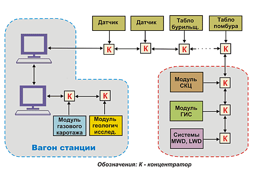 В ряде случаев совмещение этих работ в партиях ГТИ является экономически более выгодным и позволяет экономить на непроизводительных затратах по содержанию специализированных, узконаправленных геофизических партий, минимизировать транспортные расходы. Однако технических и программно–методических средств, позволяющих объединить перечисленные работы в единую технологическую цепочку в станции ГТИ, в настоящее время нет. Поэтому возникла необходимость разработки более совершенной станции ГТИ нового поколения, которая позволит расширить функциональные возможности станции ГТИ. Рассмотрим основные направления работ при этом. Основные требования к современной станции ГТИ - это надежность, многофункциональность, модульность и информативность. Структура станции приведена на рис. 5. Она построена на принципе распределенных удаленных систем сбора, которые объединены между собой с использованием стандартного последовательного интерфейса. Основными низовыми системами сбора являются концентраторы, предназначенные для развязки последовательного интерфейса и подключения через них отдельных составных частей станции: модуля газового каротажа, модуля геологических приборов, цифровых или аналоговых датчиков, информационных табло. Через такие же концентраторы к системе сбора (на регистрирующий компьютер оператора) подключаются и другие автономные модули и системы - модуль контроля качества крепления скважин (блок манифольда), наземные модули забойных телеизмерительных систем, систем регистрации геофизических данных типа «Гектор» или «Вулкан» и т.д.