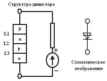 Тиристоры делятся на две группы: диодные тиристоры (динисторы) и триодные тиристоры (тринисторы). Для коммутации цепей переменного тока разработаны специальные симметричные тиристоры-симисторы. Динистор - это двухэлектродный прибор диодного типа, имеющий три p-n перехода. Крайняя область p называется анодом. Другая крайняя область n — катодом.