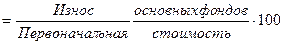 = где Тф, Тн - соответственно фактический и нормативный срок службы оборудования, лет; Q ф -среднее количество продукции, фактически произведенное за год на данном оборудовании, шт.; Q н – годовая нормативная производительность машины, шт. Физический износ проявляется в постоянной утрате технико-экономических свойств и, следовательно, в утрате потребительной стоимости, которая по мере использования основных фондов переносится на готовый продукт. Существует два метода определения физического износа основных фондов: по срокам службы и их техническому состоянию. Физический износ по срокам службы определяется по формуле: И'