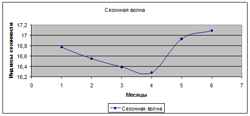 Решение: Всего за три года = I + II + III Январь = 30,2+31,5+31,2=92,9 Февраль = 29,8+31,1+30,8=91,7 Март = 29,6+30,9+30,5=91 Апрель = 29,4+30,6+30,3=90,3 Май = 30,5+31,9+31,5=93,9 Июнь = 30,8+32,2+31,8=94,8 Итого I = январь I + февраль I +март I +апрель I +май I +июнь I = 30,2+29,8+29,6+29,4+30,5+30,8=180,3 Итого II = январь II +февраль II +март II +май II +июнь II = 31,5+31,1+30,9+30,6+31,9+32,2=188,2 Итого III = январь III +февраль III +март III +апрель III +май III + июнь III = 31,2+30,8+30,5+30,3+31,5+31,8=186,1 Итого всего за три года = 92,9+91,7+91+90,3+93,9+94,8=554,6 В среднем за три года = ( I + II + III )/3 = Всего за три года/3. По этой формуле рассчитаем для всех месяцев: Январь = 92,9/3=31 Февраль = 91,7/3=30,6 Март = 91/3=30,3 Апрель = 90,3/3=30,1 Май = 93,9/3=31,3 Июнь = 94,8/3=31,6 Итого = 554,6/3=184,9 Индекс сезонности (Ис) =Всего за три года для каждого месяца / общую среднюю за три года*100%. По этой формуле рассчитае6 м для каждого месяца: Ис январь = 31/184,9*100=16,77 Ис февраль = 30,6/184,9*100=16,55 Ис март = 30,3/184,9*100=16,39 Ис апрель = 30,1/184,9*100=16,28 Ис май =31,3/184,9*100=16,93 Ис июнь = 31,6/184,9*100=17,09 Итого Ис = 16,77+16,55+16,39+16,28+16,93+17,09=100,01 Строим сезонную волну: