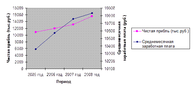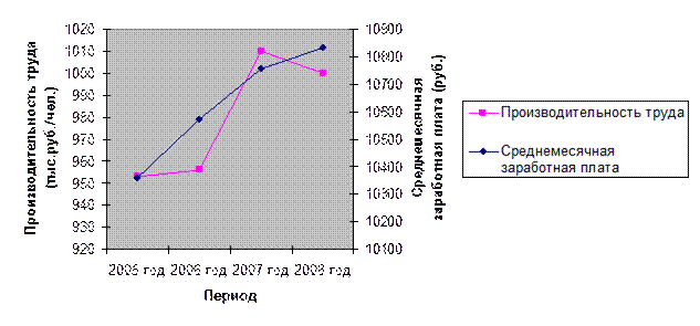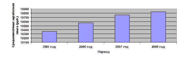 Рис. 7. Динамика среднемесячной заработной платы одного работающего в ЗАО СК «Модуль» в 2005…2008гг. Как видно из рисунка 7, на исследуемом предприятии ЗАО СК «Модуль» ежегодно происходило увеличение среднемесячной заработной платы одного работающего от 10361руб. в 2005 году до 10834руб. в 2008 году. Это увеличение связано со многими факторами, прежде всего, с увеличением должностных окладов работников управления, а также с другими выплатами стимулирующего характера.
