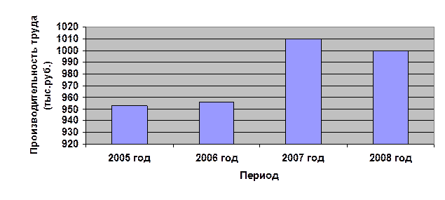 Рис. 8. Динамика производительности труда одного работающего в ЗАО СК «Модуль» в 2005…2008гг. Из рисунка 8 видно, что ежегодно происходило колебание производительности труда одного работника в пределах от 953тыс.руб. до 1010тыс.руб. Наибольший показатель производительности труда приходится на 2007 году он составил 1010 тыс.руб., с максимальным темпом роста 105,65%. В то же время, из рисунка 9 видно, что объёмы выполненных работ также имеют тенденцию к увеличению от 77175 тыс.руб. в 2005 году до 85040 тыс.руб. в 2008 году, максимальный темп роста составил 105,25 % в 2008 году. Это связано с тем фактом, что предприятие приступило к строительству домов каркасно – монолитных с увеличенным финансированием. В конечном итоге, вышеперечисленные факторы повлияли на увеличение чистой прибыли предприятия ЗАО СК «Модуль» от 10900тыс.руб. в 2005 году до 15585 тыс.руб. в 2008 году, при этом максимальный темп роста чистой прибыли составил 118,58 % в 2008 году.