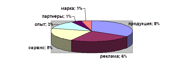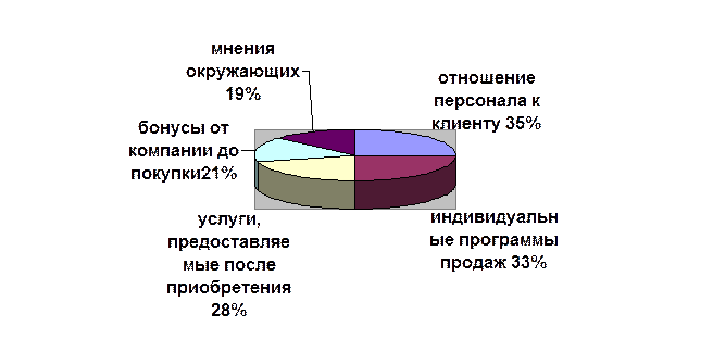 Фактически на равных позициях находятся 3 фактора: отношение персонала компании к клиенту (любой клиент должен быть значим для компании, т.к. он определяет её место на рынке); индивидуальные программы продаж (позволяют учитывать интересы и личные потребности, за счёт этого автоматически исчезает ряд проблем); услуги, предоставляемые после приобретения (позволяют клиенту постоянно ощущать себя в комфортных условиях, а компании получать хорошие рекомендации). Так же значимы для клиентов бонусы до покупки, но их наличие или отсутствие не играют решающую роль. И очень мало внимания обращается на мнения окружающих. 4. И самой важной частью связанной с организацией сервиса является, формирование элементов, составляющих этот сервис. Наряду с важностью это является самым сложным. Так как приоритетные факторы для одного клиента могут не играть никакой роли для другого. Но всё же были выделены общие предпочтения клиентов. Рассмотрим это на диаграмме 4.