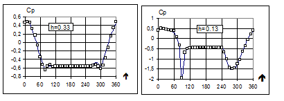 Рис. 5. Розподілення тиску на циліндрі поблизу екрану:__- розрахунок; - - експеримент (Коваленко В.М) Порівняння одержаних результатів з експериментальними даними та розрахунками інших авторів для профілю крила та автомобіля показано на рис. 6-8.