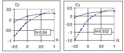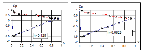 веде до збільшення підйомної сили більше ніж у два рази. Зменшення відстані до землі характеризується зростанням коефіцієнту підйомної сили до 25%. Лобовий опір при цьому зростає дуже незначно. Похідна Зменшення вiдстанi до землі з h=0,052 до h=0,016 призводить до зростання аеродинамічної якості профілю в середньому на 25% Проведена візуалізація течії в районі передньої крайки профілю показала, що в дослідженому діапазоні відносних відстаней до землі та кутів атаки відрив течії не відбувається. Розділ 3. ДОСЛІДЖЕННЯ ОБТІКАННЯ ПРОФІЛЮ ПОБЛИЗУ ЕКРАНУ МЕТОДОМ ДИСКРЕТНИХ ВИХОРІВ. Розглядаються особливості реалізації методу дискретних вихорів для моделювання плоского обтікання тіл поблизу екрану. Розроблено методику, алгоритм та програми розрахунку обтікання профілю поблизу землі методом дискретних вихорів (МДВ) (3.1). Проведено чисельні розрахунки обтікання профілів CLARK-Y та CLARK-YH у випадку безмежної рідини та поблизу екрану. Одержані результати аналізуються та порівнюються з експериментальними даними (3.2). Досліджено вплив вiдстанi до екрану на точність розрахунку аеродинамічних характеристик (рис. 2). Розділ 4. ЧИСЕЛЬНЕ МОДЕЛЮВАННЯ В’ЯЗКИХ ТЕЧІЙ. Основні проблеми чисельного розв`язку нестацiонарних рiвнянь Нав`є-Стокса в змінних вихор - функція течії в криволінійній неортогональній системі координат пов`язані з побудовою адаптивної сітки, заданням межових умов, розрахунком поля тиску, а також досягненням відповідної збіжності скінченно-різницевого аналога системи диференціальних рівнянь. Наводиться постановка задачі чисельного моделювання течії в`язкої нестисливої рідини на основі нестацiонарних рівнянь Нав`є-Стокса для ламінарного та турбулентного режимів (4.1). Для замикання осереднених рівнянь Нав’є-Стокса використано двопараметричну k -e модель турбулентності.