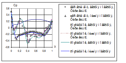 Рис. 6. Коефіцієнт тиску на профілі крила поблизу екрану:D, -експеримент (Серебрійський Я. М.), нижня та верхня поверхні;__ - розрахунок