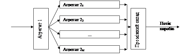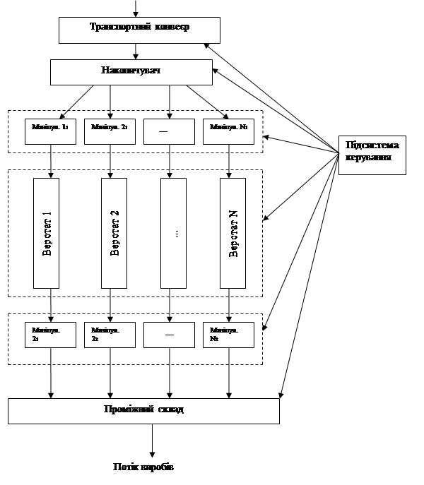 Технологічна система на даному підприємстві являє собою паралельну конвеєрну систему, тобто деякий транспортний конвеєр паралельно обслуговує визначену кількість верстатів. Структуру цієї системи можна показати за допомогою схеми на рисункі 3. Але ця структурна схема буде загальної, оскільки ми не знаємо кількісного складу даної технологічної системи. Отже, визначивши кількість елементів, що складають технологічну систему, ми зможемо побудувати схему взаємодії і саму систему в цілому.