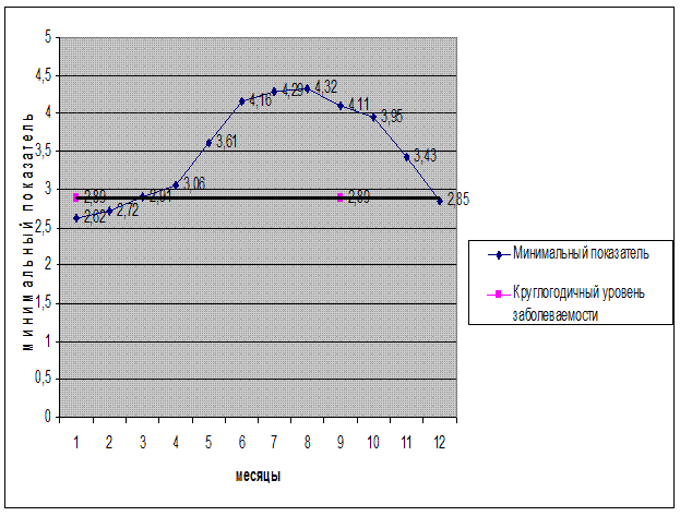 4.1. Анализ круглогодичной составляющей эпидемического процесса во внутригодовой динамике заболеваемости. Круглогодичная составляющая эпидемического процесса – это минимальный достаточный уровень заболеваемости, который необходим для сохранения циркуляции возбудителя во внешней среде. Круглогодичная заболеваемость обусловлена воздействием постоянных факторов. Таблица 6: Расчет среднего минимального уровня заболеваемости дизентерией.