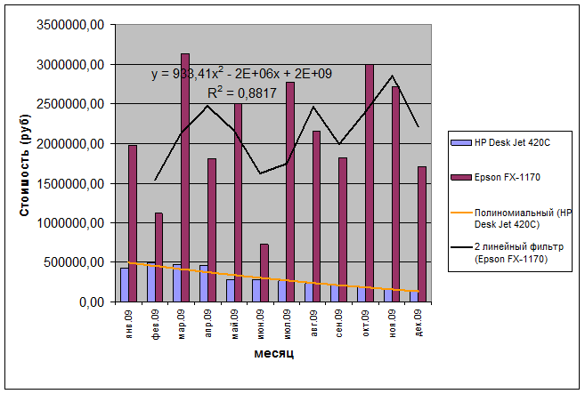 Рис.11. Диаграмма продаж за 6 месяцев. 5.6. Задание 6 Для двух видов оборудования на отдельном листе построим диаграмму, отражающую характер изменения стоимости их помесячной продажи за год. В эту диаграмму добавим соответствующие линии тренда. Выводы: • как видно из диаграммы (Рис. 12) оборудование по выбранное по критерию К по сравнению минимальной стоимостью продаётся в большем объёме: • закон изменения стоимости оборудования HPDeskJet 420C – полиномиальный, а EpsonFX-1170 – скользящее среднее (2 линейный фильтр). • коэффициент аппроксимации R2 близок к единице, что указывает на высокую степень достоверности выбранного закона.