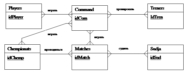 Нормализуем каждую связь используя соответствующие правила нормализации ER-диаграмм. В результате получим готовую схему данных. 3.2 Схема данных Chempionats (idChemp,NameChemp, Year) Command(idCom, NameCom, AdressCom, Gorod, History, DateSozd, mini_img, big_img) CommandInChemp (idChemp,idCom) Matches(idMatch, idChemp, DateMatch, CityMatch) MatchRezult (idMatch, Doma, Gost, ZabMjach, PropMjach) Players (idPlayer, FPlayer, IPlayer, OPlayer, DateRozhd, Grazhd, BiografPlayer, Amplua) Sostav (idCom, idPlayer, DatePokup, DateProdazh) Sudja (idSud, FSud, ISud, OSud, DateRozhd, Gorod, BiografSud) SudjiInMatch(idMatch, idSud) Treners (idTren, FTren, ITren, OTren, DateRozhd, Gorod, BiografTren) TrenersForCommand (idCom, idTren, DateNaznach, DateUchod) 3.3 Перечень и описание таблиц и их полей в сводной таблице