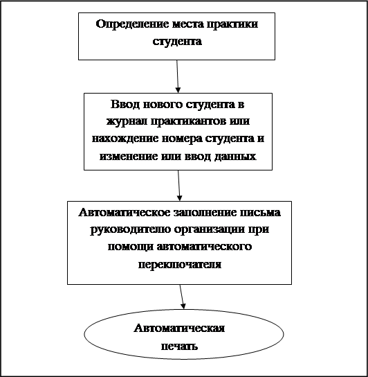 Рисунок 1 – Ручной процесс выдачи писем практикантам 3. Бизнес – процесс при автоматизированном выполнение работы заполнения и печати писем руководителю организации.При автоматизированном выполнении данной работы сокращается количество совершаемых операций, благодаря использованию макросов в Microsoft Excel. Сокращается количество затраченного времени. Сокращается число допускаемых ошибок. Освобождается время для выполнения другой важной кафедральной работы, или время личного отдыха, повышается работоспособность и настроение от быстрой и эффективной выполненной работы. Автоматизированный процесс будет выглядеть следующим образом, рисунок 2.