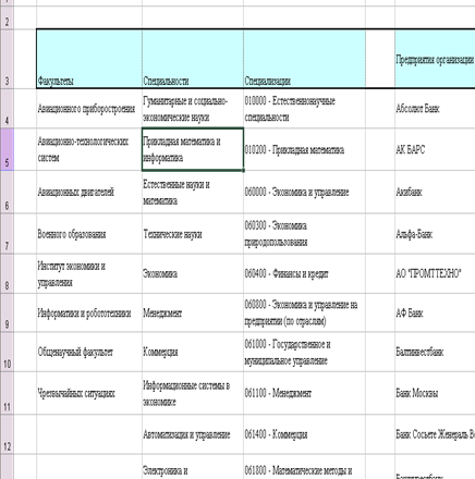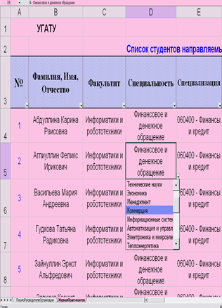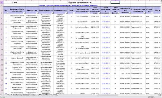 Рисунок 3 – Журнал практикантов Для автоматизации журнала создаются специальные списки с наименованием всех факультетов специальностей руководителей их научных степеней, название организаций, так как каждый год студентов распределяют в одни и те же места, рисунок 5.
