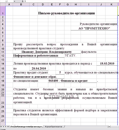 Рисунок 7 – Письмо руководителю организации Для этого вводим вспомогательные данные – заголовки, подписи строк и так далее. В графы выделенные жирным шрифтом с данными вбиваем формулы и создаем элемент управления в ячейке L1. Такими элементами управления могут являться Список и Счетчик. Для создания элементов управления используется панель инструментов Формы (Вид—Панели инструментов—Формы). Рисунок 7.1.