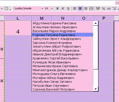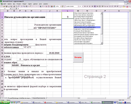 Рисунок 7.1 Счетчик и Список Используемые формулы: ВПР(L1;ЖурналПрактикантов!A4:N29;7;ЛОЖЬ) (2) Формула 2 значит что в ячейку Н5-К5 автоматически присвоится название организации из 7 столбца, по номеру из ячейки L1. Формула по изменению именительного падежа на дательный и ввод в ячейку ФИО студента из журнала осуществляется при помощи формулы 3. DativeCaseInCell(ВПР(L1;ЖурналПрактикантов!A4:N29;2;ЛОЖЬ) (3) DativeCaseInCell – формула замены падежа ее макросы на рисунке 8.