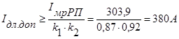 По [2] iм = 80 кА, iу = 62,5 кА iм = 80 > iу = 62,5 Условие на электродинамическую устойчивость к токам короткого замыкания выполняется. Выбор сечения отходящей кабельной линии 10 кВ Согласно [4], длительно допустимый ток кабеля напряжением 10 кВ определится: Iдл.доп ≥ IмрРП / (k1 ∙ k2 ) где к1 – поправочный коэффициент, учитывающий удельное тепловое сопротивление почвы, определяется по табл. 1.3.23 [4] (примем к1 =0,87); к2 – поправочный коэффициент, учитывающий количество работающих кабельных линий, лежащих рядом в земле, и расстояние в свету, определяется по табл. 1.3.26 [4] (примем к=0,92);