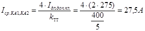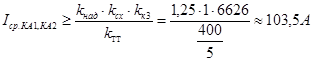где кнад – коэффициент надежности (примем 1,25); ксх – коэффициент схемы (для неполной звезды ксх =1); ктт – коэффициент трансформатора тока (ктт =400/5). Согласно рекомендациям § 11.1 [2] в данном случае ток срабатывания реле КАЗ, КА4 следует рассчитать следующим образом: