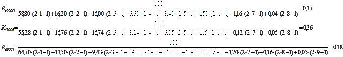 где Ув - удельный вес товарной продукции отдельных отраслей, начиная с наибольшей, в %, i - порядковый номер отрасли, начиная с наибольшей. Рассчитаем коэффициент по каждому отдельному году, для того, чтобы посмотреть его в динамике: