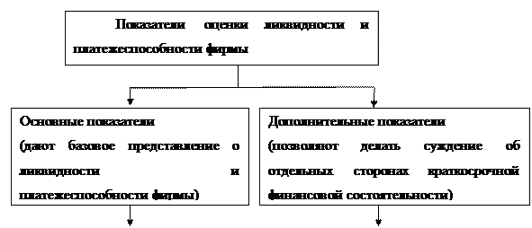 - Величина собственных оборотных средств - Коэффициент текущей ликвидности - Коэффициент быстрой ликвидности - Коэффициент абсолютной ликвидности - Коэффициент покрытия оборотных активов собственным капиталом - Коэффициент маневренности оборотных активов - Коэффициент маневренности собственных оборотных средств - Продолжительность финансового цикла Рис. 2. Классификация оценки финансовой состоятельности фирмы в краткосрочной перспективе[5] Из абсолютных показателей основным является величина собственных оборотных средств (СОС). Он рассчитывается как разница между оборотными активами и краткосрочными пассивами (обязательствами) и равен величине собственного оборотного капитала (СОК). СОС= ОА-КО; СОК=СК+ДО-ВОА где: СК – собственный капитал; ДО – долгосрочные обязательства; ВОА – внеоборотные активы. На основании этого показателя можно определить, какую модель управления собственными оборотными средствами использует компания: идеальную (СОС=0), классическую (СОС>0) или агрессивную (СОС<0). Стоит отметить, что «являясь абсолютным, показатель СОС не приспособлен для пространственно-временных сопоставлений; поэтому в анализе более активно применяются относительные показатели – коэффициенты ликвидности»[6] . Коэффициент текущей ликвидности (Ктл) или коэффициент покрытия - это отношение ликвидных оборотных средств к сумме краткосрочной задолженности. Ктл=ОА/КО Он показывает, сколько рублей оборотных средств (текущих активов) приходится на один рубль текущей краткосрочной задолженности. В финансовой теории существуют примерные нормативы этого показателя. Например, в западной практике его критериальное значение не меньше 2; в российской практике приблизительно 1,8. Однако в настоящее нестабильное время нормирование этого показателя становится невозможным и теряет смысл, т.к. он включает в себя много факторов и должен оцениваться отдельно для каждого предприятия по его балансовым данным. Но чем выше этот показатель, тем более привлекательна компания для кредиторов. При исчислении коэффициента быстрой ликвидности (Кбл) из расчета исключается наименее ликвидная часть оборотных активов – производственные запасы: Кбл=(ОА-З)/КО Этот коэффициент характеризует ту часть текущих обязательств, которая может быть погашена за счет денежных средств и ожидаемых поступлений за отгруженную продукцию. Одна из основных проблем, возникающих при расчете этого показателя, состоит в определении статей дебиторской задолженности, включаемых в расчет. Поэтому, в том случае, «если анализ ведется внешним пользователем информации, ему придется ориентироваться на расшифровки дебиторской задолженности в приложении к бухгалтерскому балансу и на пояснительную записку, а при отсутствии такой информации желательно придерживаться осторожного подхода в оценке надежности нераскрытых сумм дебиторской задолженности»[7] . Коэффициент абсолютной ликвидности (Кал) это отношение денежных средств к краткосрочным обязательствам. Кал=ДС/КО Он показывает, какая часть краткосрочных обязательств может быть погашена немедленно, за счет имеющихся на расчетном счете денежных средств. В нынешних условиях этот коэффициент имеет больше аналитическое значение, т.к. практически «у многих предприятия он измеряется сотыми долями единицы из-за отсутствия дене
