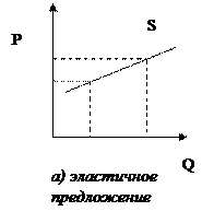 Рис. 1.3. Форма эластичности спроса по цене Эластичность спроса по цене зависит от ряда факторов: 1) незаменимость. Если у товара есть заменители (товары-субституты), то спрос будет более эластичным, противоположным образом влияет отсутствие таковых; 2) значимость товара для потребителя. Как правило, неэластичным является спрос на товары первой необходимости, а более эластичным – на все другие группы товаров; 3) удельный вес в доходах и расходах. Товары, на которые тратится значительная доля средств, эластичны, а занимающие незначительную долю бюджета – неэластичны; 4) временные рамки. Эластичность спроса увеличивается в долгосрочном периоде и становится менее эластичной на коротких промежутках времени. 3. предложение и закон изменения предложения Под предложением западные экономисты понимают чье-либо желание продать товар. Объем предложения при этом составляет то количество товара, которое продавцы готовы предложить покупателю в конкретном месте и в конкретное время. Предложение – количество благ, предлагаемых для продажи на рынке в определенный момент или период времени. А объем предложения – это количество товара, которое продавцы готовы произвести и продать в течение определенного промежутка времени. Объем и структура предложения характеризуют экономическую ситуацию на рынке со стороны продавцов (производителей) и определяются размерами и возможностями производства, а также той долей товаров, которая направляется на рынок, ибо часть производимой продукции потребляется в производстве. Объем предлагаемого к продаже товара при прочих равных условиях будет тем меньше, чем выше цена на товар, то есть между предложением и ценой существует прямая зависимость. Эта зависимость называется законом предложения.