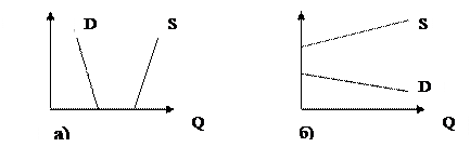 Рис.2.2. а) Объем предложения превышает объем спроса при любой неотрицательной цене; б) цена предложения превышает цену спроса при любом неотрицательном объеме