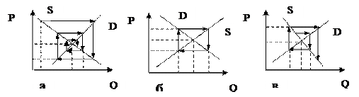 Рис. 2.8. Рыночное равновесие а) при росте спроса; б) при росте предложения; в) при одновременном и однонаправленном изменении спроса и предложения . Паутинообразная модель – модель, изображающая траекторию движения к состоянию равновесия, когда реакция предложения или спроса запаздывает. Она описывает динамический процесс: траекторию корректировки цен и объема производства при движении от одного состояния равновесия к другому; используется для описания колебаний цен на рынках сельскохозяйственной продукции; на биржевом рынке, где предложение реагирует на изменение цен с некоторым запозданием. Рассмотрим вариант динамической модели рынка одного продукта. Допустим, что объем спроса зависит от уровня цен текущего периода, тогда как объем предложения – от уровня цен предыдущего периода: