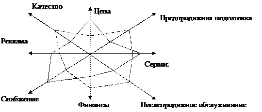 Исследование конкурентов должно быть направлено на те же сферы, которые были предметом анализа потенциала собственного предприятия. Это может обеспечить сравнимость результатов. Удобным инструментом сравнения возможностей предприятия и основных конкурентов является построение многоугольников конкурентоспособности, представляющих собой графические соединения оценок положения предприятия и конкурентов по наиболее значимым направлениям деятельности, представленных в виде векторов-осей (рисунок 3).