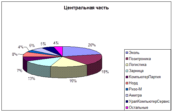 В результате обработки и анализа полученных данных была cформирована таблица 6, характеризующая долю рынка основных конкурентов как в целом по рынку, так и по его выделенным территориальным элементам. Таблица 6 - Доля фирм в целом по рынку и по отдельным его территориям