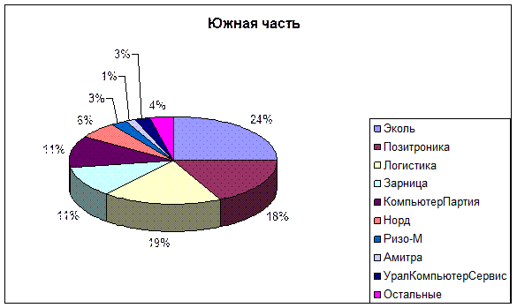 Рисунок 10. Доля фирм-конкурентов по южной части города Анализируя вышеприведенную таблицу и диаграммы, можно сделать вывод о том, что безусловным лидером на рынке компьютерной техники города Миасса является ООО «Эколь», которая охватывает 24% всего рынка. Наиболее наглядно ее первенство проявляется в 2 сегментах: Северная и Южная часть города (24% и 25,0% доли рынка соответственно). Это связано с раскрученным именем организации, активной рекламной кампанией, эффективным территориальным расположением торговых точек, развитой системой кредитования. Исследуемая организация «Позитроника» охватывает 15% компьютерного рынка г. Миасса, 18 доли рынка в Центральной части города, 18 в Южной и 10% в Северной части. Организации, а также потребители, обладающие средним уровнем знаний в области компьютерной техники, предпочитают совершать покупку у специализированных компьютерных фирм, обладающих более обширным ассортиментом предлагаемой техники, имеющими возможность собрать системный блок полностью в соответствии с потребностями и предпочтениями потребителя или привезти желаемые комплектующие под заказ, при этом немаловажен фактор времени, необходимый на обработку и выполнение этого заказа. Торговые фирмы, для которых реализация компьютеров является лишь одним из нескольких видов деятельности, предлагают рынку уже готовые системные блоки фирменной сборки московских организаций, в которых возможности замены комплектующих строго ограничены. Таким образом, они ориентируются в первую очередь на покупателей-новичков, легко поддающихся убеждению со стороны подготовленного торгового персонала и не предъявляющих специфических требований к составу системного блока. Второе маркетинговое исследование опиралось на данные, полученные в ходе проведенного анализа особенностей потребительского поведения на рынке компьютерной техники города Миасса. Одним из направлений исследования было выявление степени значимости для потребителя отдельных факторов, определяющих его покупательское поведение. Респонденту предлагалось расположить представленные варианты ответов в порядке их значимости в процессе принятия решения о покупке (1 – наиболее значимый фактор, 8 – наименее значимый фактор в процессе принятия решения о покупке). Было собрано 250 заполненных анкет, после обработки которых полученные данные можно представить в виде таблицы 7. Таблица 7 - Распределение ответов респондентов