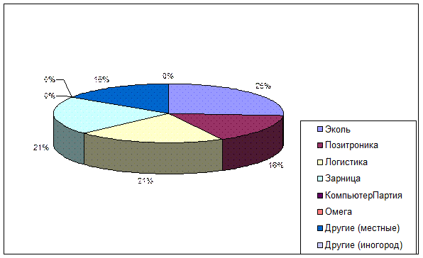 Рисунок 13. Доля фирм-конкурентов в целом по рынку бюджетных организаций Основными конкурентами в этом сегменте рынка являются следующие организации: лидером, как и в сегменте частных лиц, является компания «Эколь», которая обслуживает основную часть рассматриваемого сегмента; конкурентом в области продажи государственным учреждениям выступает «Зарница», она занимает 21 %; фирма «Позитроника» занимает 16 %, эта организация стремительно набирает обороты, и вскоре может встать на один уровень с лидирующими организациями в сфере бюджетных продаж. Некоторые коммерческие организации, зарегистрированные на территории г. Миасса, приобретают технику у иногородних компьютерных фирм (преимущественно Челябинских), что определяется более обширным ассортиментом предлагаемой продукции и более низкими ценами, предлагаемыми крупными Челябинскими организациями. «Позитроника» обслуживает четверть бюджетных организаций, для таких организаций большую роль играет ценовой фактор. Анализируя структуру распределения долей рынка по сегменту юридических лиц, можно придти к выводу, что 84% спроса на компьютерную технику со стороны организаций обслуживается 4 организациями, что объясняется особенностями, обуславливающими процесс принятия решения о покупке ответственным лицом организации. Для большинства коммерческих организаций основными факторами, влияющими на выбор фирмы-контрагента являются: уровень цены, предложенный фирмой, надежность фирмы, возможности организации по выполнению заказа на приобретение специфической техники, скорость выполнения заказа, предоставление дополнительных корпоративных скидок, опыт работы с данным контрагентом, возможность предоставления гибкой системы взаиморасчетов. Для бюджетных организаций, работающих на основе тендерных котировок, ценовой фактор является решающим, так как из всех коммерческих предложений фирм должно быть выбрано одно с наименьшим уровнем цены. На основании проведенного анализа рынка компьютерной техники города Миасса, можно сделать следующие выводы: · для рассматриваемого рынка характерен высокий уровень конкурентной борьбы вследствие наличия большого количества фирм, предлагающих дифференцированную продукцию; · текущее состояние рынка с точки зрения теории жизненного цикла можно охарактеризовать как этап зрелости, для которого свойственен высокий уровень насыщения первичного спроса, имеющего тенденцию к постепенному сокращению; · на рынке присутствует явный лидер, обладающий долей рынка, превышающей 25% в сегменте частных лиц и 26% в сегменте организаций, - компания «Эколь»; объект исследования - фирма «Позитроника» - занимает второе место в тройке лидеров и обслуживает 17,1 % потребительского спроса; · основными факторами, определяющими потребительское поведение частных лиц, являются: уровень цены, известность фирмы на рынке, удобное месторасположение магазина и выгодная система кредитования. Ценовая стратегия Ценовая стратегия, которую избирает торговая фирма, является одним из ведущих факторов, определяющих ее конкурентоспособность на рынке. Фирма, предлагающая потребителю тот же товар, что и ее конкуренты, но по более низкой цене, обладает одним из основных конкурентных преимуществ. Однако, тенденция к снижению цены на товар (в результате уменьшения величи