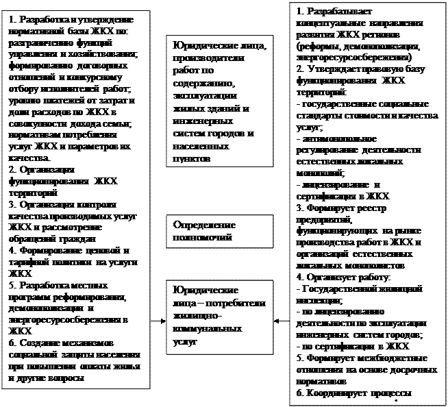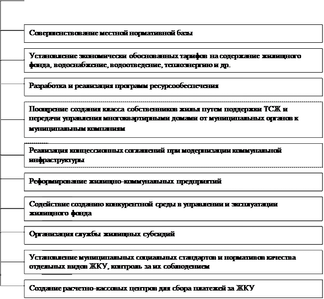 Рис. 3. Задачи органов местного самоуправления по реформированию ЖКХ[13] В каждом муниципальном образовании должна быть разработана собственно экономически и социально обоснованная программа реформирования жилищно-коммунального комплекса, учитывающую местную специфику направленная на специфику, направленная на осуществление перехода на систему договорных отношений между органами местного самоуправления, собственниками и нанимателями жилищного фонда, управляющими организациями и исполнителями жилищно-коммунальных услуг, создание конкурентной среды в сферах управления жилищным фондом и его эксплуатации, а также системы концессионных соглашений по передаче в управление частному бизнесу систем инженерного обеспечения населенных пунктов. На этой основе должно быть обеспечено существенное повышение качества предоставления ЖКУ. В системе управления муниципальных администраций имеются структурные подразделения, отвечающие за вопросы ЖКХ. Важно их укреплять, осуществлять переподготовку специалистов применительно к новой экономической и управленческой ситуации в сфере ЖКХ, обучать их работе с населением, немуниципальными управляющими и эксплуатирующими организациями. Как известно, из федерального бюджета не предусмотрено вести финансирование непосредственных расходов по содержанию ЖКХ, но часть расходов бюджет страны всегда брал на себя. Центр может стимулировать экономию издержек производства и работ (услуг), регулировать тарифы. Несколько иные задачи и права имеют субъекты Российской Федерации, которые мы выделили ранее. То есть, по сути, они должны заниматься региональными проблемами и регулировать те направления функционирования и развития экономики, которые им непосредственно подотчетны. Им принадлежит право в решении энергетических проблем, установлении социальных и экономических нормативов, обеспечении социальной защиты населения. Региональная власть выступает исполнителем политики государства на местном уровне. В существенной степени это относится к сфере ЖКХ. И она ответственна за формирование действенного экономического механизма управления ЖКХ и социальной защиты населения, чтобы свести до минимума негативные последствия рыночных преобразований. Основной же объем работ приходится на местный уровень власти. Местные бюджеты обязаны финансировать затраты ЖКХ в той мере, в какой их не покрывают платежи населения за услуги, оказываемые ЖКХ. Муниципальные органы досконально знают реальную ситуацию в экономике в своем районе, могут воздействовать на многие стороны ЖКХ, на обеспечение субсидиями населения, на финансирование затрат по содержанию ЖКХ и др.[14] Актуальными по мнению ученых СКАГС Игнатова В.Г., Кюрджиева С.П., Уваровой Г.Г., Рудого В.В. является определение критериев позволяющих выявить где есть необходимость формирования новой или сохранения существующей системы управления жилищным фондом и предоставления коммунальных услуг, какая из них более отвечает современным требованиям. По их мнению, главными критериями должны стать эффективность и рентабельность работы, качество оказываемых услуг, степень удовлетворения потребностей населения. Авторы выделяют ряд дополнительных критериев поддержки малых предприятий в сфере ЖКХ: 1) отраслевой критерий (приоритетные отрасли да