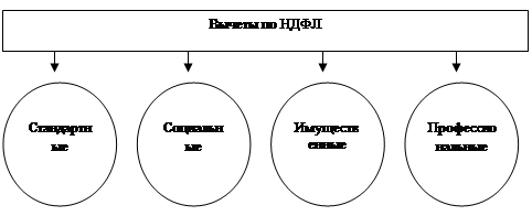 Рисунок 4 – Вычеты по НДФЛ Глава 23 НК РФ предусматривает четыре вида налоговых вычетов (см. рис. 4) [4]. Все эти вычеты предоставляются налоговой инспекцией, где предприниматель состоит на учете, на основании его заявления. Заявление предоставляется вместе с налоговой декларацией за прошедший год. Порядок определения суммы налога, которая должна быть уплачена, зависит от того, по какой ставке облагается доход, полученный предпринимателем: по ставке 13% либо по ставке 35% или 9% [4]. Доход, облагаемый по ставке 13%, должен быть уменьшен на сумму налоговых вычетов. Доход, облагаемый по другим ставкам (35% или 9%), на налоговые вычеты не уменьшается. В общем случае сумма налога, подлежащая внесению в бюджет предпринимателем, определяется следующим образом (см. рис. 5.)