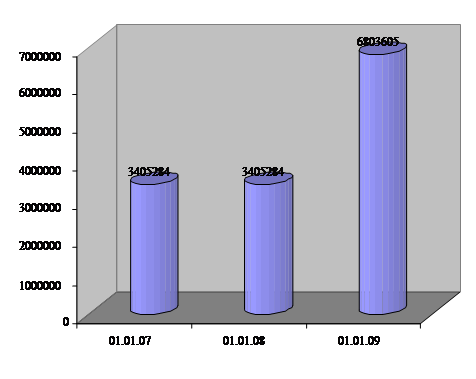 Рис. 1. Ссудная задолженность ОАО АКБ «МКБа» в 2006- –2008 г.г. (в тыс. руб.) Из рисунка 1 видно, что во втором периоде ссудная задолженность увеличилась на 26 % , а в третьем периоде еще на 21 %. 2.Собственные средства и их источники. Собственные средства ОАО АКБ «МКБ» составили 10045870 на 01.01.07 г., 10830174 тыс. руб. на 01.01.08 г. и 20799741 тыс.руб. на 01.01.09 г.. Удельный вес источников собственных средств в составе пассивов составил 8,83 % , 8,01 % и 10,3 % соответственно. Уставный капитал на 01.01.07 г. и 01.01.08 г. составлял по 3405284 тыс. руб., а к 01.01.09 г. увеличился до 6803605 тыс. руб.