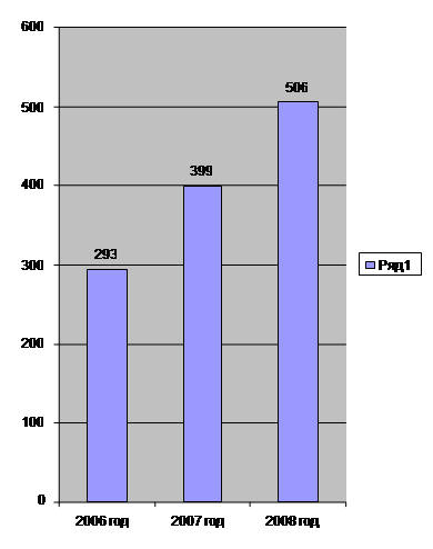 В таблице 2 представлены данные о кредитах, выданных юридическим лицам ОАО АКБ «МКБ-ом» в 2006-2008 г.г. Анализируя данные этой таблицы можно сделать вывод о тенденции к увеличению выдачи кредитов. Это можно объяснить ростом малого и среднего бизнеса в России в последние годы, в частности за счет налоговых льгот, инвестирования, разнообразных программ кредитования. Ведь говоря о кредитовании юридических лиц в российской банковской практике, в первую очередь подразумевается именно этот вид заемщиков. На рисунке 3 отражены эти данные.
