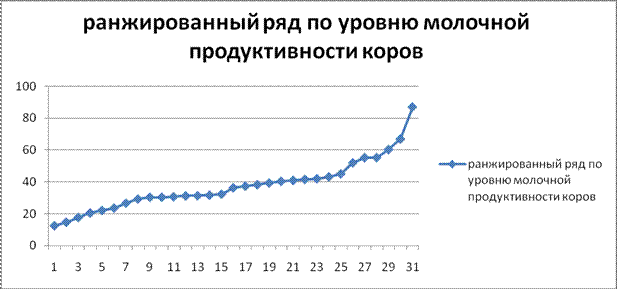 Для большей наглядности изобразим ранжированный ряд графически. Для этого на оси абсцисс расположим хозяйства в порядке возрастания группировочного признака, а по оси ординат - величину молочной продуктивности коров, соответствующую хозяйству, рис.1.