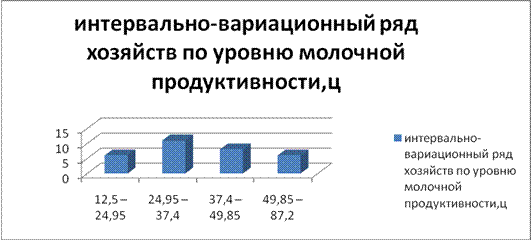 Проанализируем данные ранжированного ряда и его графика - оценим характер и интенсивность различий между хозяйствами и попытаемся выделить существенно отличные группы хозяйств. Между хозяйствами имеются существенные различия в уровне молочной продуктивности коров: размах колебаний составляет 12,5 – 87,2 = 74,7 ц. от 1 коровы, а уровень производства молока в хозяйстве №1 выше, чем в №31 в 7 раза (87,2/12,5). Возрастания продуктивности молока от хозяйства к хозяйству происходит в основном постепенно, плавно, без больших скачков, но у последнего хозяйства удой от 1 коровы существенно отличается от остальной массы хозяйств. Но это хозяйство нельзя выделить в отдельную группу, а также поскольку между остальными хозяйствами различия небольшие, без скачков и нет других данных, указывающих границы перехода от 1 группы к другой, то выделить типичные группы на основании анализа ранжированного ряда в данном случае нельзя. Поэтому далее необходимо построить интервальный ряд распределения хозяйств. Интервальный вариационный ряд дает возможность получить представление о количестве и характере групп. Вначале решим вопрос о числе групп, на которые следует распределить совокупность хозяйств. Приближенное число n можно определить по формуле (1): n = 1+3.322LgN, (1) где n - число групп, N - совокупность единиц. Эта зависимость может служить ориентированной при определении числа групп в этом случае, если распределение единиц совокупности по данному признаку приближаются к нормальному и применяются равные интервалы в группах. n = 1+3.322Lg31 = 1+3.322*1,49 ~ 6 групп. Далее необходимо определить величину интервала I по формуле (2): i = (Xmax - Xmin ) / n , где (2) Xmax - максимальное значение признака в изучаемом ранжированном ряду, Xmin - минимальное значение признака в изучаемом ранжированном ряду, n - число групп. I = (87,2 – 12,5)/6 = 12,45 Теперь построим ряд распределения хозяйств при этой величине интервала, значение Xmin = 12,5 ц, тогда верхняя граница первой группы составит: Xmin + i = 24,95 ц. Эта граница одновременно является границей второй группы. Границы остальных групп определяются аналогично. Полученные данные Представлены в таблице 2. Таблица 2. Интервальный ряд распределения хозяйств по уровню молочной продуктивности коров.
