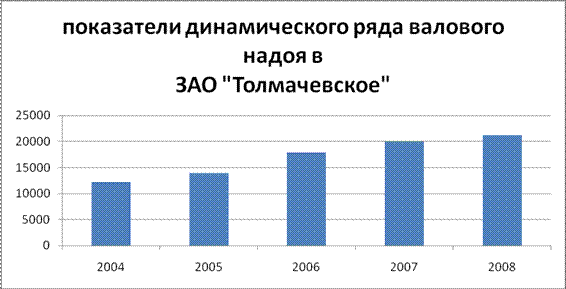 Из расчётов видно, что валовой надой колеблется в пределах от 12286 до 21157. Средний показатель надоя в ЗАО «Толмачевское» равен 17078,8. Ближайшим показателем к среднему является надой 2006 (17909 ц.).