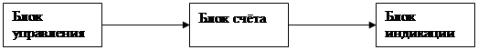 Рис. 4 Суммирующий счетчик параллельного действия Разряды счетчика – триггеры DD1, DD2, DD3. Схема управления – элемент DD4. Достоинство данного счетчика – малое время установки, не зависящее от разрядности счетчика. Недостаток – сложность схемы при повышении разрядности счетчика. Выбор схемы Нужно спроектировать суммирующий двоично-десятичный счетчик импульсов. Для данного счётчика подойдёт схема параллельного суммирующего счётчика, т. к. этот вариант отличается хорошим быстродействием, что важно при индикации на семисегментных индикаторах, т. к. там, помимо самого счёта, учитывается время реагирования дешифратора. Я же проектирую счётчик с индикацией на светодиодах, и меня устроил бы менее «быстрый» счётчик, но лучше сделать счётчик как можно более универсальным (например, чтобы работал с разным вариантом индикации), да и более высокая скорость срабатывания лучше, чем низкая, поэтому я выбрал схему параллельного счётчика. Составление структурной схемы счётчика Структурная схема – совокупность блоков счётчика, выполняющих какую-либо функцию и обеспечивающих нормальную работу счётчика. На рисунке 7 показана структурная схема счётчика.