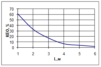 Рис.3. График зависимости коэффициента естественного освещения от расстояния от окна в лаборатории Так как лаборантской учитель химии выполняет зрительные работы первого разряда (размер наименьшего объекта различения менее 0,15 мм), то согласно СНиП 23-05-95 «Естественное и искусственное освещение» для данного разряда зрительных работ нормируемое значение КЕО равно 1,2 %, при боковом освещении. Проанализировав полученные значения и сопоставив их с нормативным было выявлено несоответствие КЕО в лаборантской норме. 2.3.2 Искусственное освещение Нормируемыми параметрами при искусственном освещении являются горизонтальная освещенность рабочей поверхности Ен, а также пульсация светового потока. Для общественных зданий нормируется также цилиндрическая освещенность, которая характеризует общую светонасыщенность помещения. Поэтому проведем измерения горизонтальной и цилиндрической освещенности в химической лаборатории. Измерения проводятся следующим образом. С помощью люксметра замеряется освещенность в точках 1, 2, 3, расположенных на высоте 0,8 м (на уровне рабочей поверхности учителя) и естественная освещенность в этих же точках (рис.4). Для каждой точки рассчитаем КЕО. Полученные данные заносим в таблицу 2.