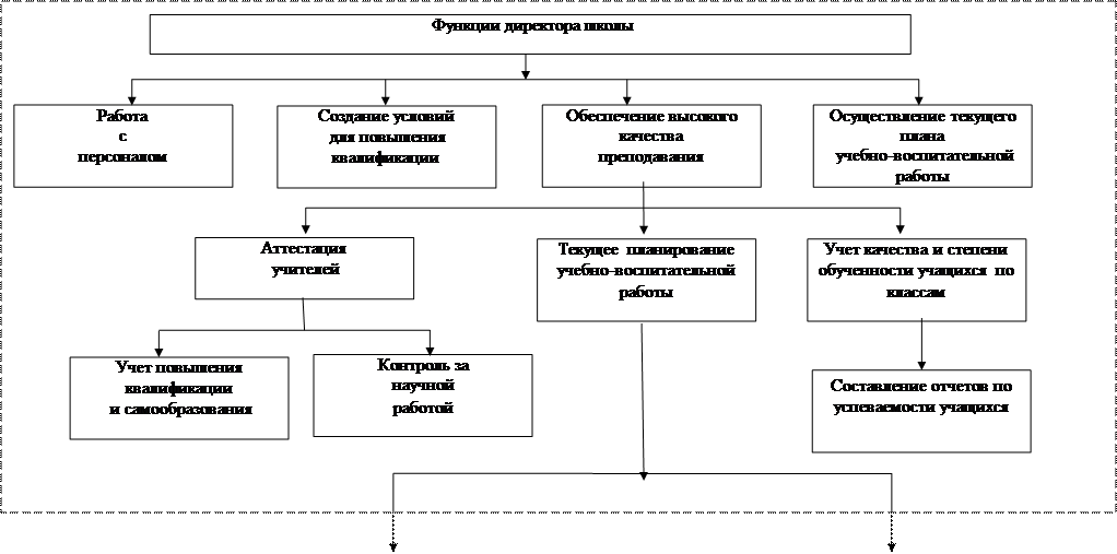 2.3 Анализ использования разработки Приложение базы данных «Школьник» построено таким образом, что его можно использовать практически в любом городе, где есть начальные и средние школы. Для среднетехнических, высших учебных заведений она будет малопригодна, вследствие больших различий в организации учебного процесса. В общем, система ориентирована на использование ее работниками (директором, завучами, преподавателями и учениками) начальных и средних школ. 2.4 Анализ методов решения проблемы В современных условиях важной областью стало информационное обеспечение, которое состоит в сборе и переработке информации, необходимой для принятия обоснованных управленческих решений. Передача информации о положении и деятельности предприятия на высший уровень управления и взаимный обмен информацией между всеми взаимными подразделениями организации осуществляются на базе современной электронно-вычислительной техники и других технических средств связи. Информация служит основой для подготовки соответствующих докладов, отчетов, предложений для выработки и принятия соответствующих решений. Содержание каждой конкретной информации определяется потребностями управленческих звеньев и вырабатываемых управленческих решений. К информации предъявляются определенные требования: - по объекту и качеству – краткость и четкость формулировок, своевременность поступления; - по целенаправленности – удовлетворение конкретных потребностей; - по точности и достоверности – правильный отбор первичных сведений, оптимальность систематизации и непрерывность сбора и обработки сведений. 2.5 Целесообразность внедрения ИС Внедрение программного обеспечения в школе будет способствовать: - уменьшению рутинной работы завуча и директора школы; - уменьшению времени на обработку информации, фильтры, поиск, аналитика данных поспособствуют облегчать работу с данными; - обеспечению достоверности информации (уменьшение возможности допустимости ошибки); - повышению уровня защищенности информации от несанкционированного доступа, потери или искажения; - замене бумажных носителей данных на электронные, что приведёт к более рациональной организации переработки информации на компьютере и снижению объемов документов на бумаге. 2.6 Декомпозиция комплекса задач Декомпозиция комплекса задач директора представлена на рисунке 2.3. Основными направлениями деятельности директора школы являются: - организация методической, научно-исследовательской, экспериментальной и инновационной работы в школе, руководство ей и контроль за развитием этого процесса; - работа с персоналом; - создание условий для повышения квалификации; - обеспечение высокого качества преподавания; - осуществление текущего плана учебно-воспитательной работы; - учет качества и степени обученности учащихся по классам; - составление отчетов по списочному составу классов; - контроль за научной работой; - методическое руководство педагогическим коллективом; - создание кабинетной системы в школе и постоянное её совершенствование; - контроль над проблемными подростками; - профессиональная подготовка. На рисунке пунктиром выделены функции директора школы, требующие автоматизированного решения. 2.7 Обоснование выбора задач, входящих в комплекс На основе рассмотренной декомпозиции был произв